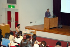 米国栄養士会研究部長 Esther Myers博士(登録栄養士)が、エビデンスに基づいた栄養ケアの実践、栄養ケアプロセス、栄養アセスメント、栄養診断[問題の明確化]とその記載方法、栄養介入、栄養モニタリング・評価について講義を行いました。