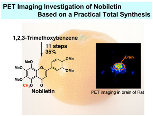 薬学部の菅敏幸教授らは、独自に開発したフラボン合成法を利用して、柑橘類に含まれるノビレチンの大量合成に成功しました。さらに、合成ノビレチンにより放射活性化合物の迅速合成と精製が可能となり、本学の奥直人教授と浜松ホトニクスの塚田秀夫博士らのグループとの共同研究により、PET解析を実施しました。近年ガン検診などに使われるPET解析は、生きた生物の動態解析が可能な有用な方法です。今回、マウスで解析を行ったところ、ノビレチンは5分後の脳に移行していることが明らかとなりました。これまでに、ノビレチンがアルツハイマー病の予防や治療に有用であるという報告はありましたが、このような研究は世界初です。静岡特産の「みかん」が健康長寿に有用であることは、うれしいニュースです。